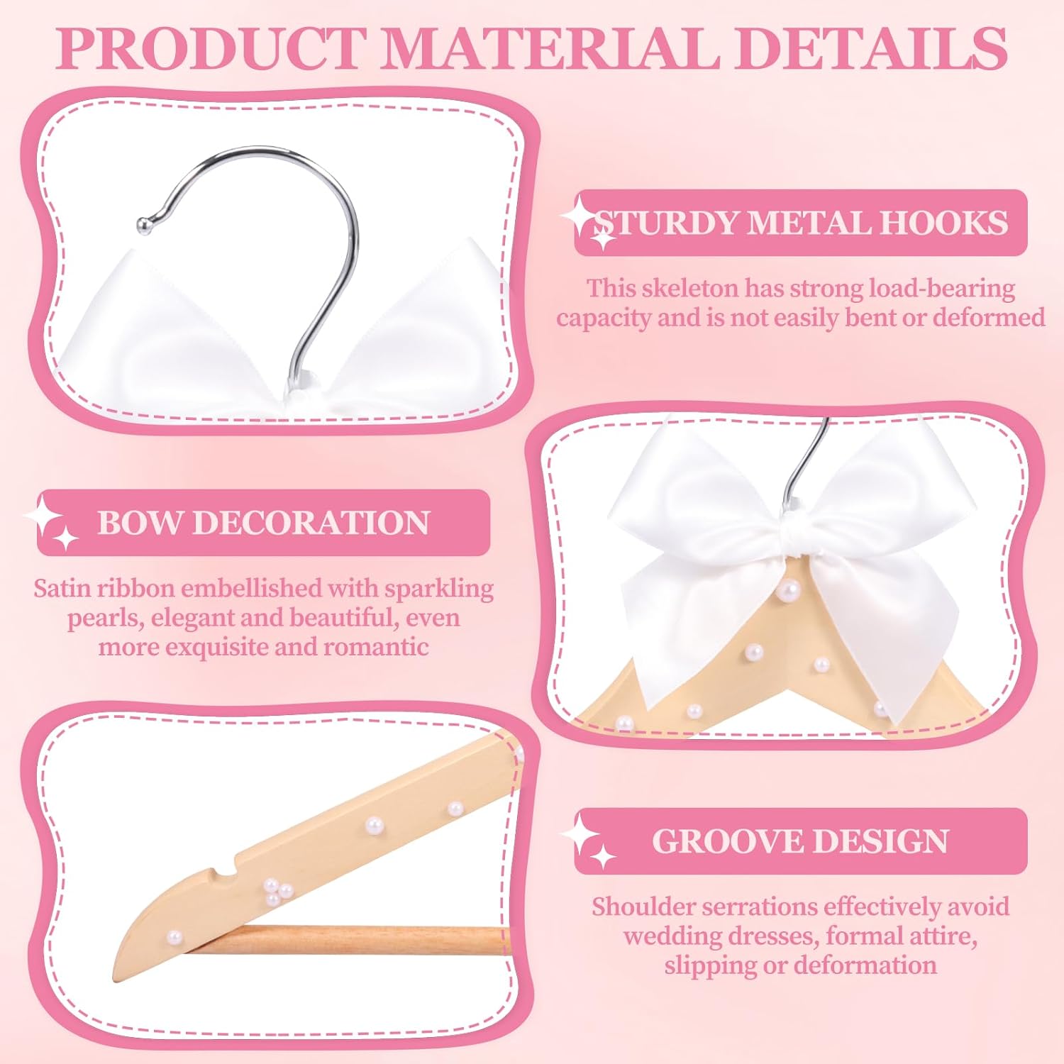Product description Parts List:12×Wooden Bridal Dress HangerDescription:This wedding hanger features faux pearls and ribbon bow design, creating an elegant and romantic look ideal for hanging wedding gowns and bridesmaid dresses. Made of premium wood, it can ensure the protection of precious garments. Each hanger is a sentimental wedding souvenir.Features:Suitable for Delicate Fabric: This bridal dress hanger can protect precious garments. It is suitable for hanging delicate fabrics like silk and lace.Specification:Product Name: Wooden Bridal Dress HangerMaterial: Wood + MetalSize: 45 x 23 x 1.1 cm (17.72 x 9.06 x 0.43 inches)Hook Height: 7 cm (2.76 inches)Hook Opening Width: 4 cm (1.57 inches)Color: BurlywoodNote:1. There may be slight differences between the picture and the actual color of the commodity. We will try our best to show you the exact color.2. Please allow slight dimension differences due to manual measurement. Manufacturer Contact Information Does Not Apply