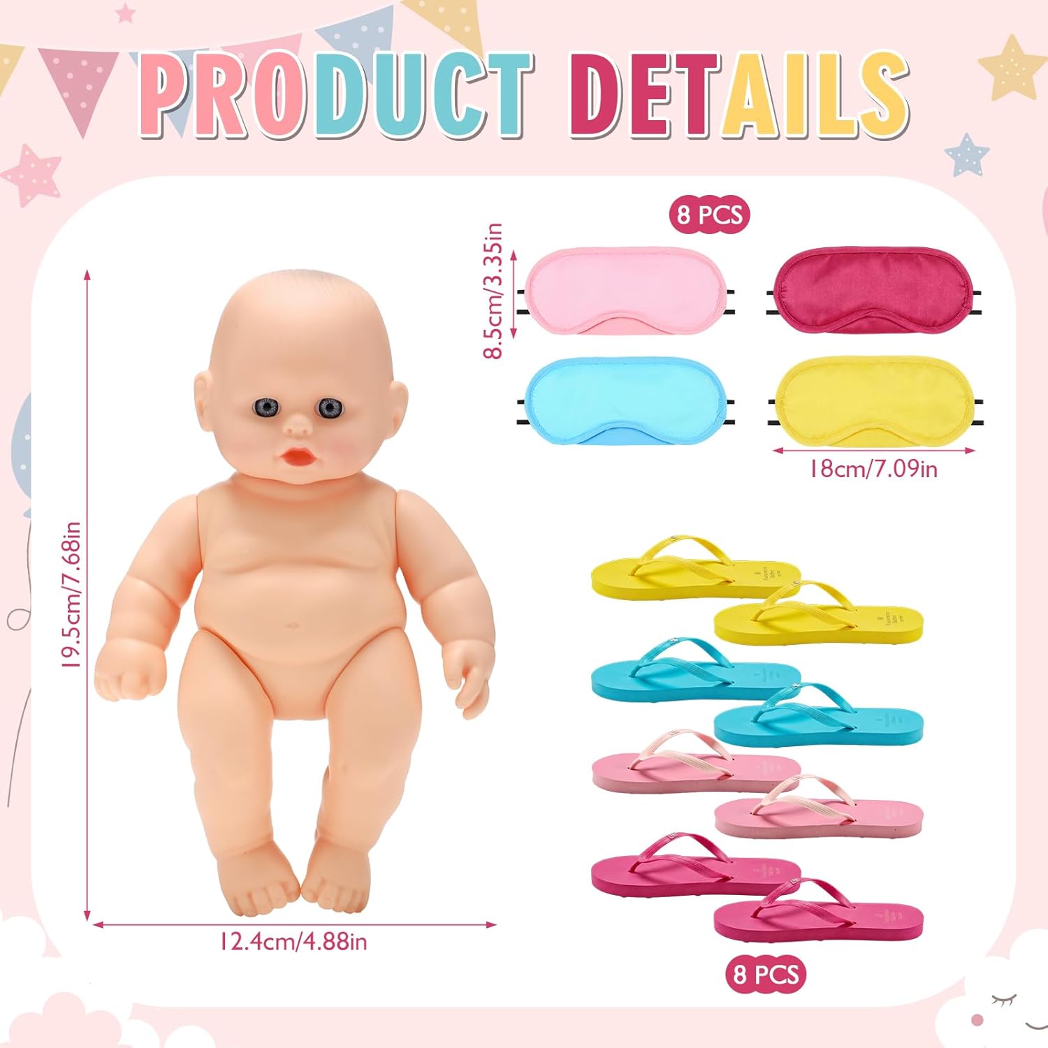 Features: Thoughtful Gift: You can give this baby shower game set as a thoughtful gift to expectant parents, friends, and neighbors. Funny and Meaningful: These baby shower games can bring party guests closer together, and you can even add prizes to make the games more exciting. Specifications: Color: Colorful Package includes: 8 x Slippers 8 x Baby doll 8 x Eye masks Notes: Manual measurement, please allow slight errors on size. The color may exist a slight difference due to different screen displays