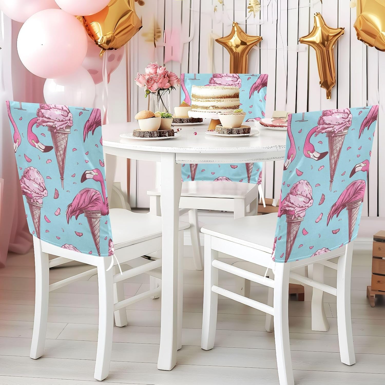 Chair Cover Material made of polyester,comfortable and soft to touch,reusable and suitable for long term use Features easy to install and remove, tie rope design at the bottom,machine washable Stylish Chair Decoration With beautiful pattern,it can be used for family party/ birthday party/wedding/ holiday party to add atmosphere, also can be used for chair decoration in living room, dorm, kitchen dining room,bedroom to bring protection to the chair while avoiding stains to dirty the chair back. Easy To Care Machine washable, Not washing with hot water, Not bleaching