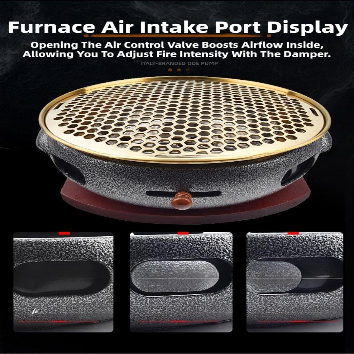 Item Name: Handmade Korean Charcoal Grill Material: Cast Iron Feature: Portable design, adjustable ventilation for optimal grilling, independent charcoal plate, easy to clean, and removable grill grate enhance your cooking experience. Applicable scenarios and occasions: Ideal for home, outdoor parties, camping, picnics, and grilling enthusiasts for yakiniku and barbecues. Style/Appearance: Elegant design with a wood base, perfect for tabletop grilling. Origin: China.