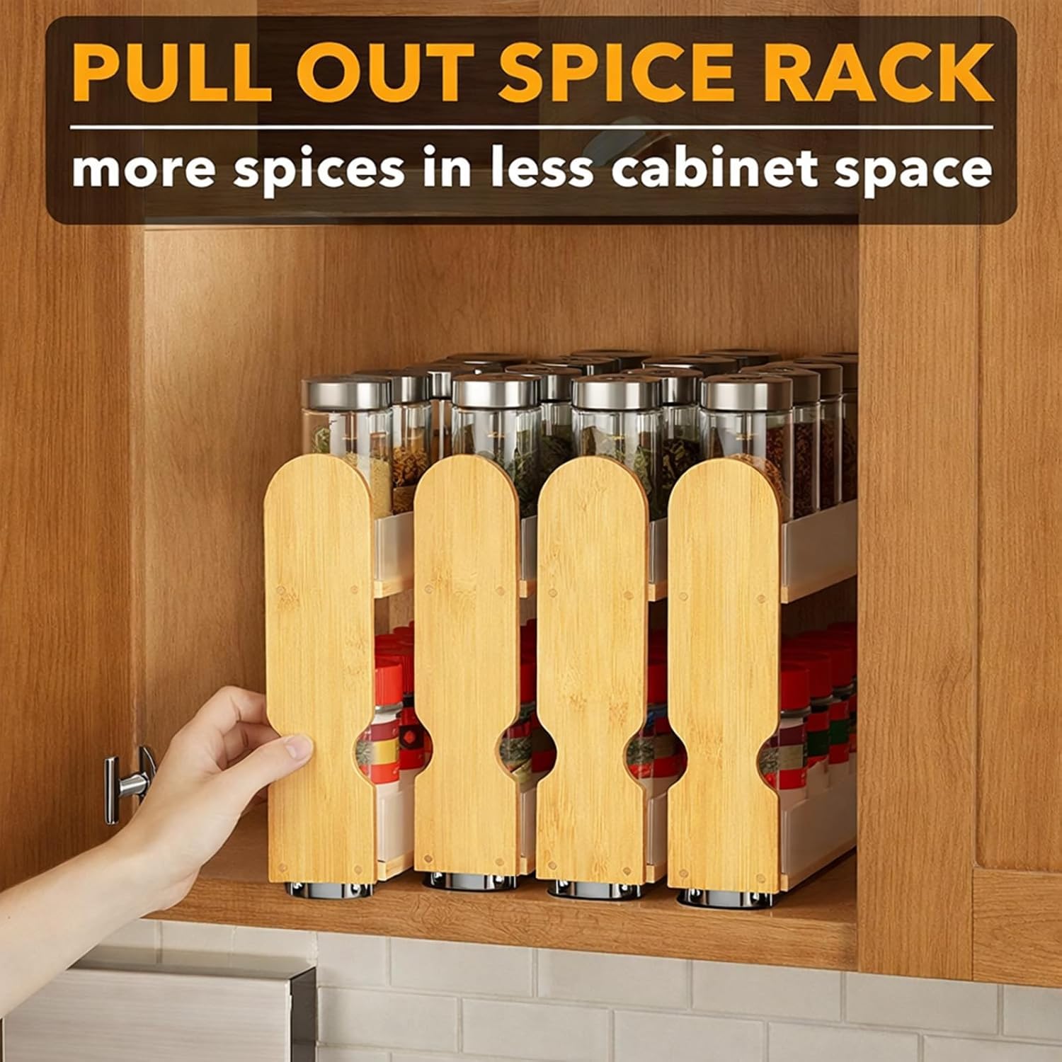 Features: Multi-functional application scenarios: This storage rack can not only be applied in the kitchen storage cabinet, but also be placed on the kitchen countertop or under the counter for storage. Besides spices, this storage rack can also be applied to store tea bags, snack bags, beauty products, etc. Its multi-functional design is suitable for various storage methods, meeting the needs of bathrooms, garages or dormitories, etc Easy to clean: The smooth bamboo surface resists stains easily and can be wiped clean with a damp cloth. Unlike metal racks, it won't rust or corrode over time. Regular dusting preserves its natural beauty, ensuring it remains a functional and beautiful addition to your home. Specifications: Material: bamboo Color: natural wood Size: 10.1" W x 10.6 D x 9.6 H Package includes: 1 x Pull-out sliding spice rack Notes: Manual measurement, please allow slight errors on size. The color may exist a slight difference due to different screen displays. Our products have strong adhesive, please do not stick them on the paper cabinet, paint cabinet, in case of damage to the furniture. Small parts included, please keep them away from little kids to avoid swallowing risk